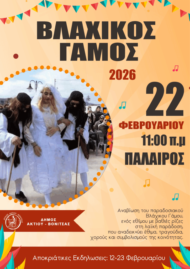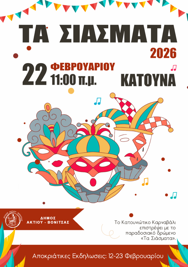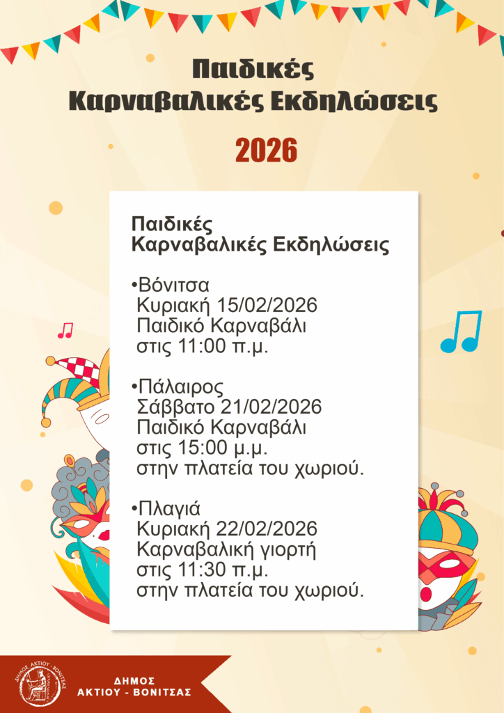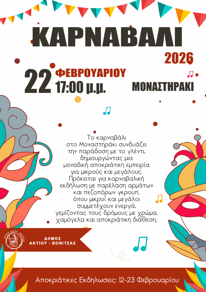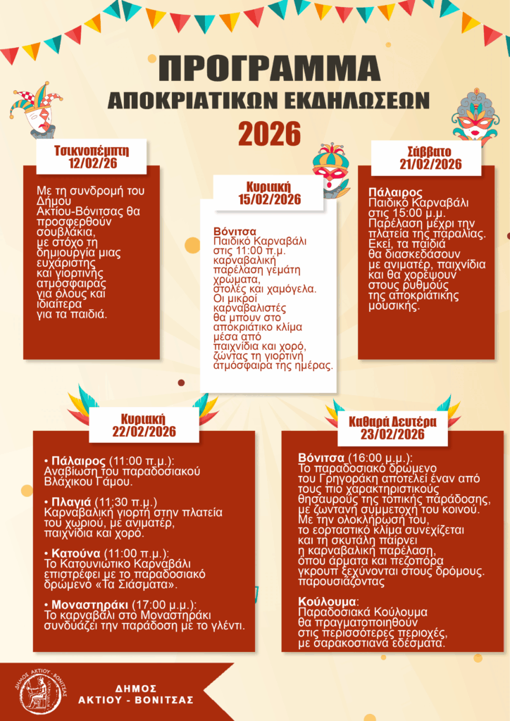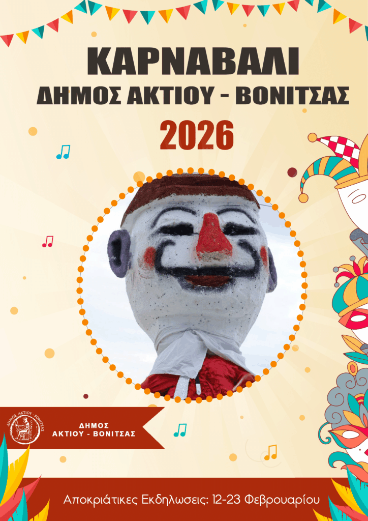 Ο Δήμος Ακτίου-Βόνιτσας παρουσιάζει το πρόγραμμα των αποκριάτικων και καρναβαλικών εκδηλώσεων για το 2026, καλώντας κατοίκους και επισκέπτες να ζήσουν από κοντά ένα πλέγμα δράσεων που απλώνεται σε πολλές κοινότητες και συνδυάζει το παραδοσιακό στοιχείο με τη συμμετοχή των παιδιών και των οικογενειών. Οι εκδηλώσεις αξιοποιούν έθιμα που έχουν καθιερωθεί διαχρονικά στην περιοχή, ενώ παράλληλα δίνουν χώρο σε σύγχρονες μορφές διασκέδασης, πάντοτε σε δημόσιους, ανοιχτούς χώρους, με στόχο να ενισχυθεί η κοινωνική συνοχή και να αναδειχθεί η τοπική πολιτιστική κληρονομιά.